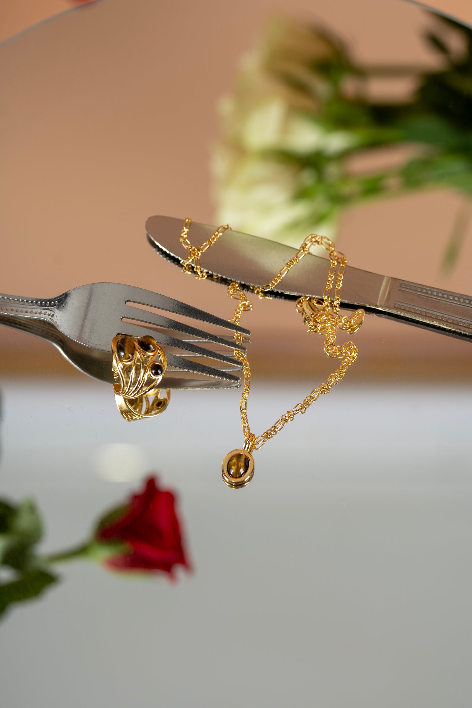 A timeless statement of vintage elegance, the Marrakech Necklace blends old-world charm with modern sophistication. Crafted from 18K gold-plated brass, its delicate yet bold design is enhanced by a natural Tiger’s eye stone pendant, radiating strength and confidence. Inspired by the rich textures and mystique of Marrakech, this piece is perfect for layering or wearing solo as a standout accessory.